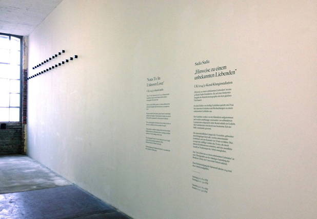 Exhibition history: The audio installation of ‘Notes To An Unknown Lover’ premiered in its original thirty-channel iteration at the Spinnerei Rundgang in Leipzig, Germany in 2014. In October 2017 it ran as part of the show ‘Poetry’, at the George Paton gallery in Melbourne, Australia as part of “an exhibition of text-based works that bear a formal relationship to the space they occupy; such as the page, the book, the screen, the board, the wall, me, space, or take an art work as a starting point. Think of concrete poetry, text-works that utilise the page/book as a formal device, ekphrastic poems, word paintings, performance poetry, word & text-based video, and audio works.” For this exhibition, the work was processed in stereo with 3D audio software creating psychoacoustic sound localisation and distance cues.